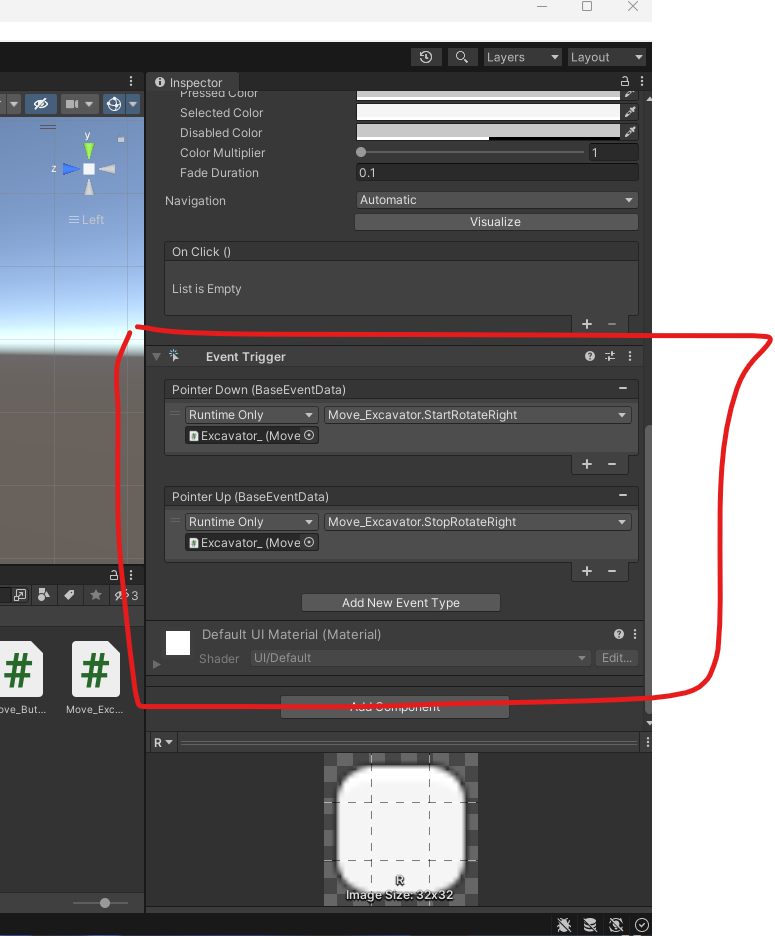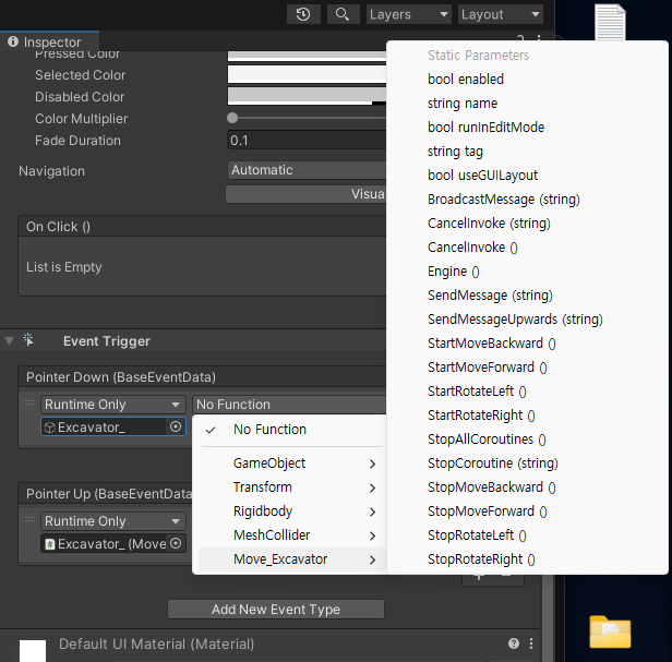 - 그 중에 나는 내가 만든 Script ‘Move_Excavator’ 에서 오른쪽으로 도는 함수를 넣을 것이다.