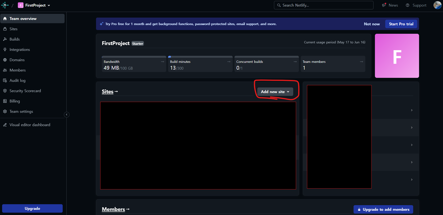 1. Netlify 사이트에 들어가서 GitHub와 연동하여 계정 로그인을 한 후 첫 프로젝트 생성합니다.
