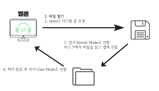 - 커널이 디스크에서 파일을 읽고 앱에 전달 → 하면 다시 User Mode로 전환