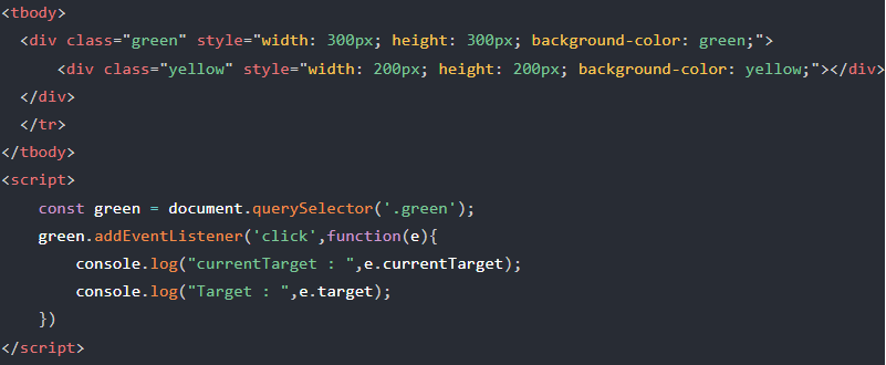 - 먼저 녹색 div를 클릭하시면 두 요소 모두 녹색 div를 가리킴. 그리고 노란색 div를 클릭하시면 currentTarget은 녹색 div, target은 노란색 div를 가리킴.