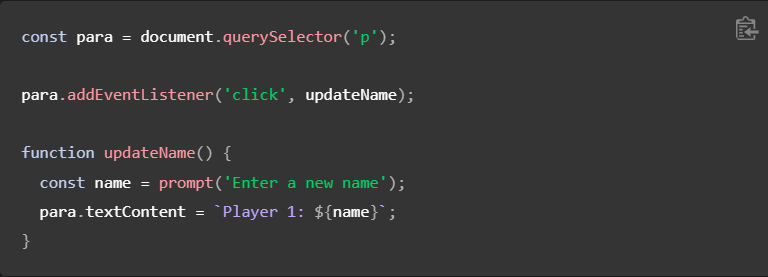 - 프로그래밍에서 "문자열"(string)이라고 부르는, 텍스트 조각을 조작. 위 예제에서는 문자열 "플레이어 1: "과 name 변수의 값을 합쳐 온전한 텍스트 레이블("Player 1: Chris")을 생성함.