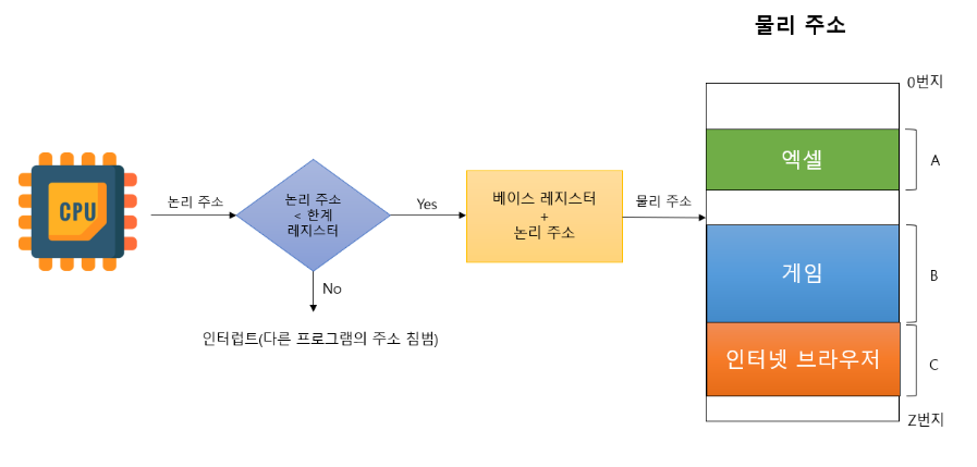 논리 주소 + 베이스 레지스터 = 물리 주소