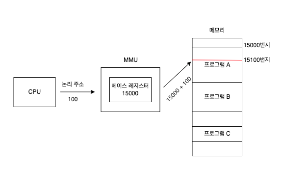 베이스 레지스터에 15000이 저장되어 있고 CPU가 발생시킨 논리 주소가 100번지라면 이 논리 주소는 물리 주소 15100번지로 변환됨
