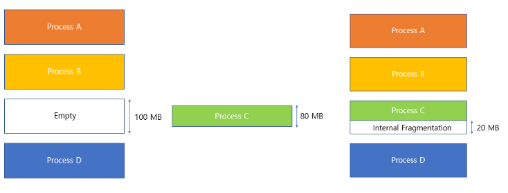 → 전체 용량은 충분해도, 연속된 공간이 없으면 큰 프로세스는 못 들어감! - → 각 빈 공간에는 그 크기보다 작거나 같은 프로세스만 들어갈 수 있음