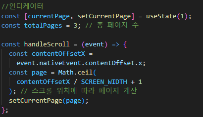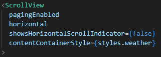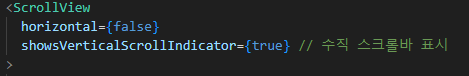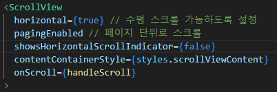 - pagingEnabled는 React Native의 ScrollView 컴포넌트에서 사용되는 속성으로, 페이지 단위 스크롤이란 뜻입니다.