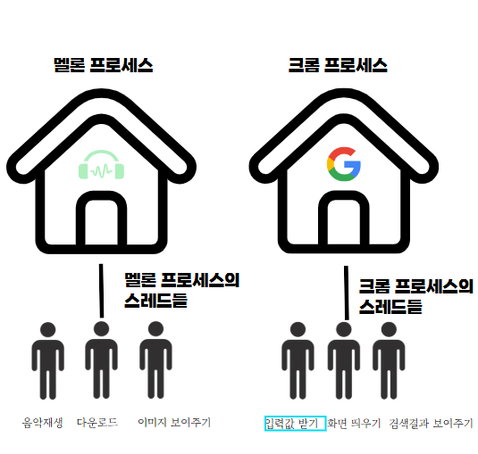 - ex) 멜론 프로세스도 있고 크롬 프로세스도 있는 것
